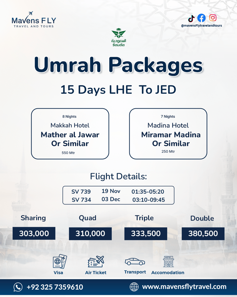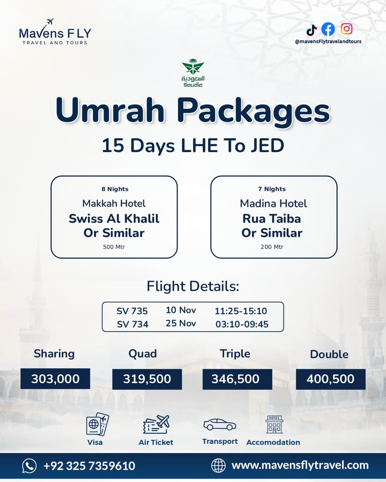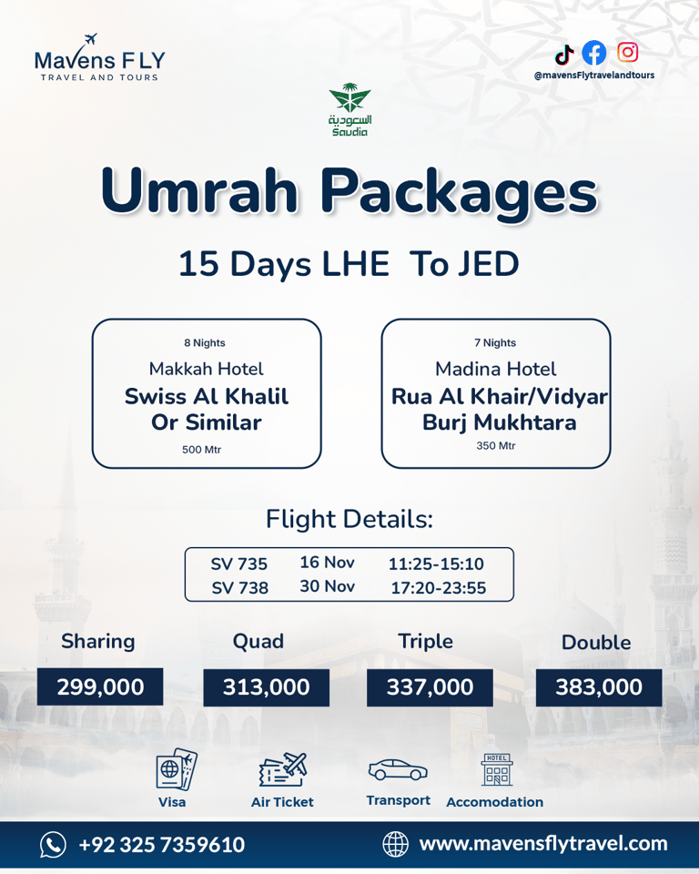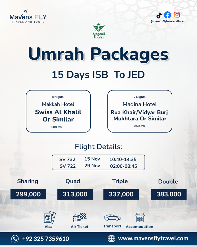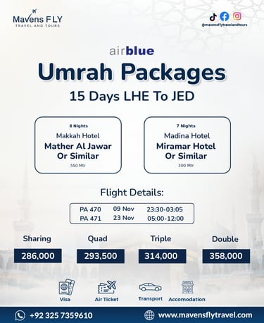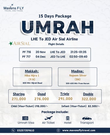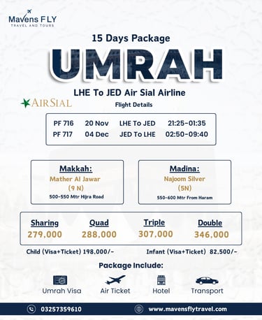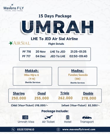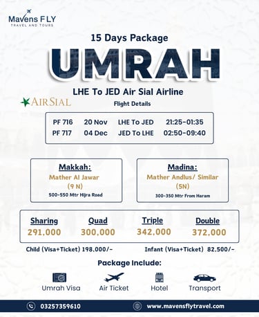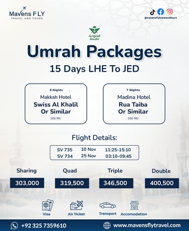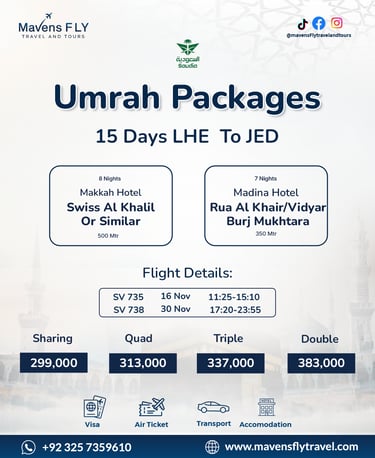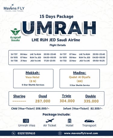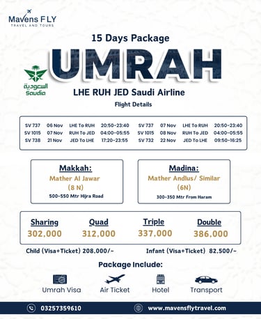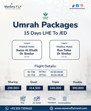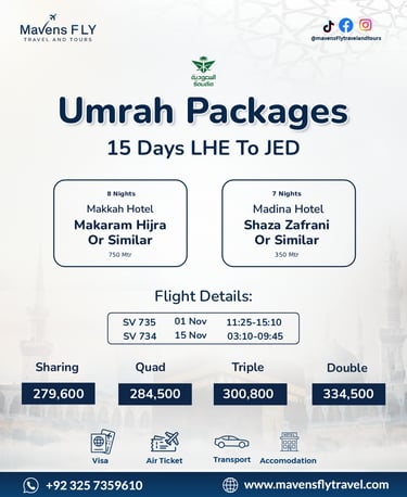 We specialize in Umrah & Hajj packages, international tours (like Dubai, Turkey, Malaysia, etc.), visa services, and flight bookings — all tailored to your comfort and needs.