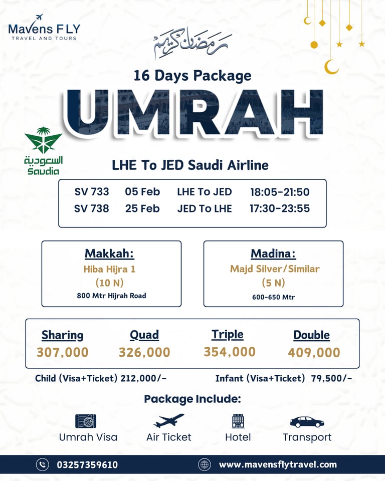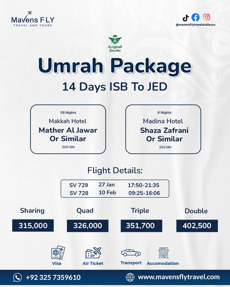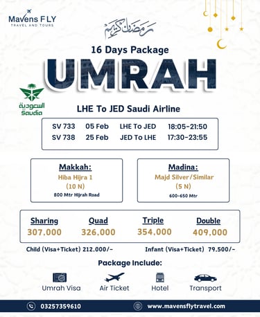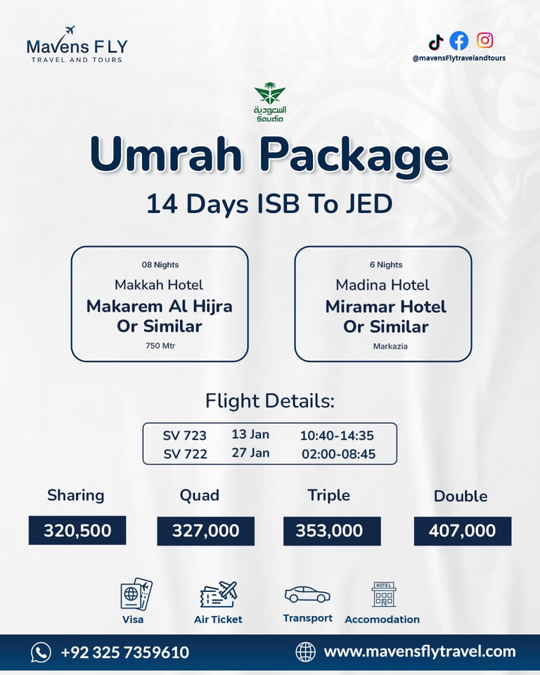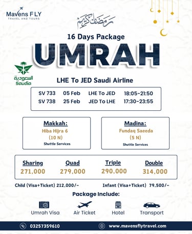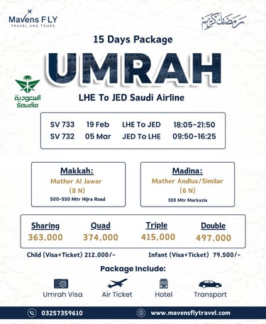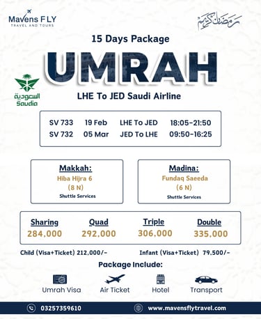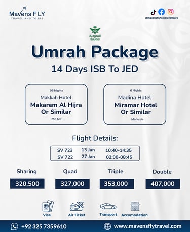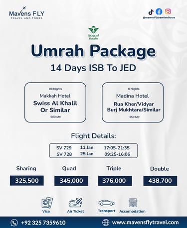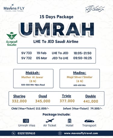 We specialize in Umrah & Hajj packages, international tours (like Dubai, Turkey, Malaysia, etc.), visa services, and flight bookings — all tailored to your comfort and needs.